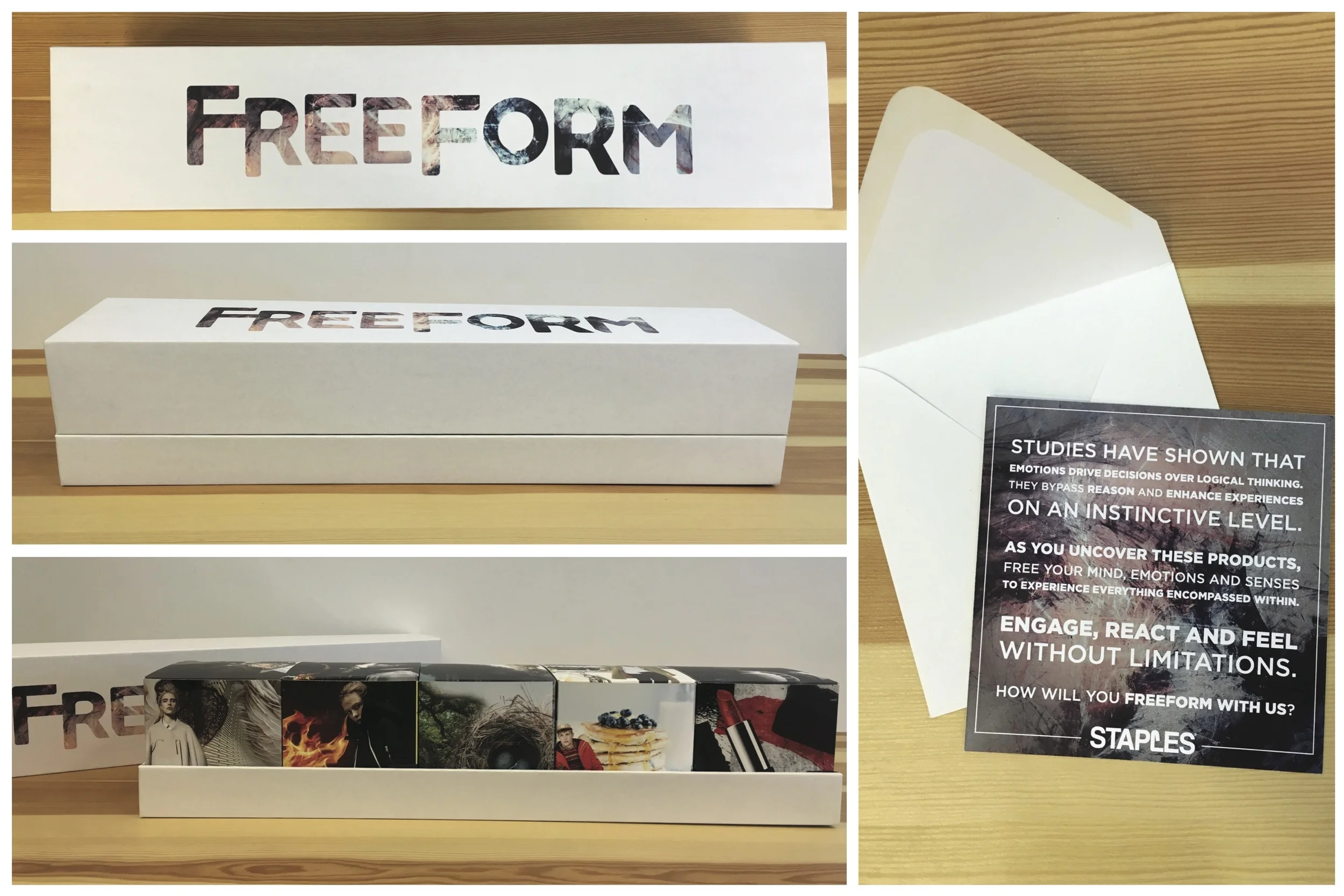 As the Senior Art Director for the New Business Acquisition and Retention team for Staples Promotional Products, I was asked to ideate on a show-stopping gate crasher that focused on the hottest trends and how they applied to the client. I partnered with my Senior Creative Merchandiser to brainstorm trends, and came up with an oversized packaging project. This "kit" was made up of a larger telescoping exterior box, with 5 individual trend boxes inside, all containing a unique item specific to that trend. The end result was very positively received and set a new bar for creative execution with our Senior leadership team.